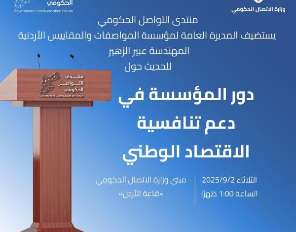 ويتمحور اللقاء حول جهود المؤسسة في الرقابة على السلع وأدوات القياس القانونية ودورها في تعزيز ثقة المواطنين بالمنتج الوطني والأسواق المحلية إلى جانب دور المؤسسة في إصدار المواصفات القياسية والقواعد الفنية الأردنية، وبما يسهم في حماية المستهلك والبيئة وضمان جودة المنتجات الوطنية وفق أفضل الممارسات الدولية لتعزيز تنافسية الاقتصاد الأردني.
