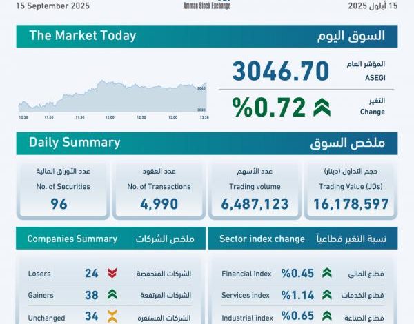 وعن مستويات الأسعار، فقد ارتفع الرقم القياسي العام لأسعار الأسهم لإغلاق هذا اليوم إلى 3046 نقطة، بارتفاع نسبته 0.72 بالمئة.