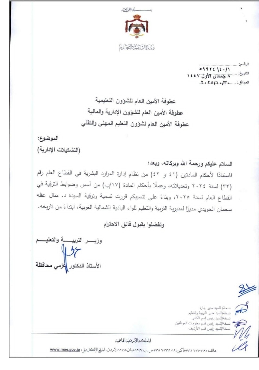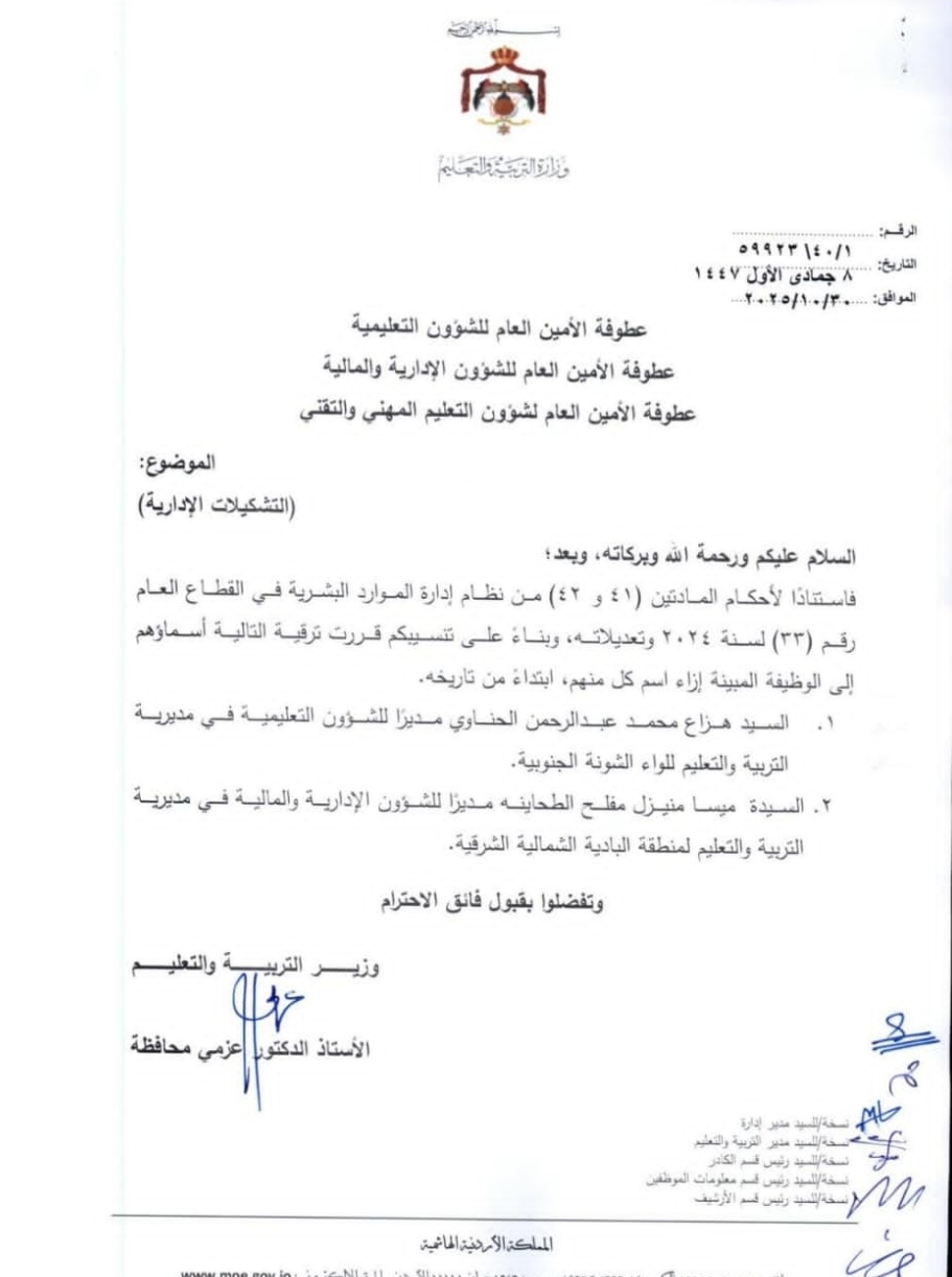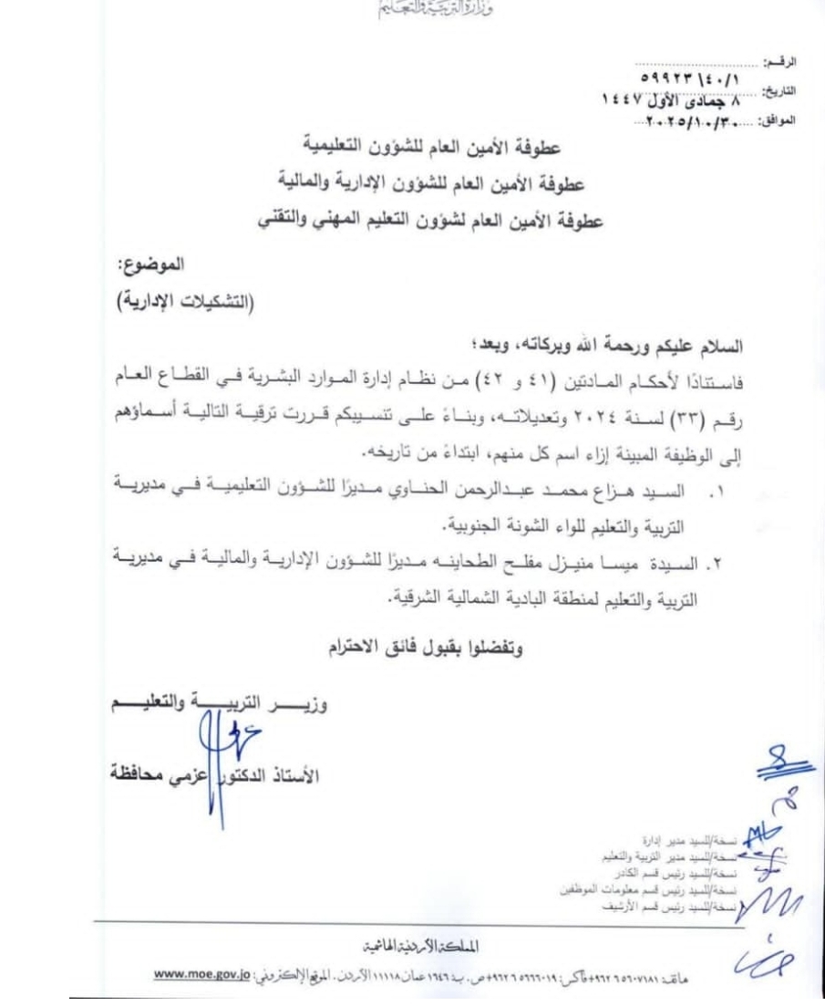 وشملت التشكيلات تعيين مدراء تربية ومدراء للشؤون الادارية والمالية