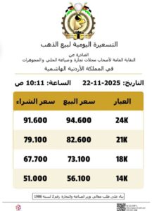 ووفق النقابة العامة لأصحاب محال تجارة وصياغة الحلي والمجوهرات، ارتفع سعر بيع غرام الذهب من عيار (21) ليسجل 82.60 دينارا، والشراء 79.10 دينارا.