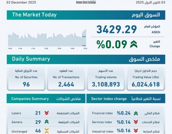 بلغ حجم التداول الإجمالي في بورصة عمان، اليوم الأربعاء، 6 ملايين دينار وعدد الأسهم المتداولة 3.1 مليون سهم، نفذت من خلال 2464 عقدا.