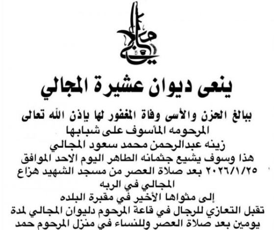 وسيشيع جثمانها الطاهر اليوم الاحد الموافق ٢٠٢٦/١/٢٥ بعد صلاة العصر من مسجد الشهيد هزاع المجالي في الربة إلى مثواه الأخير في مقبرة البلدة