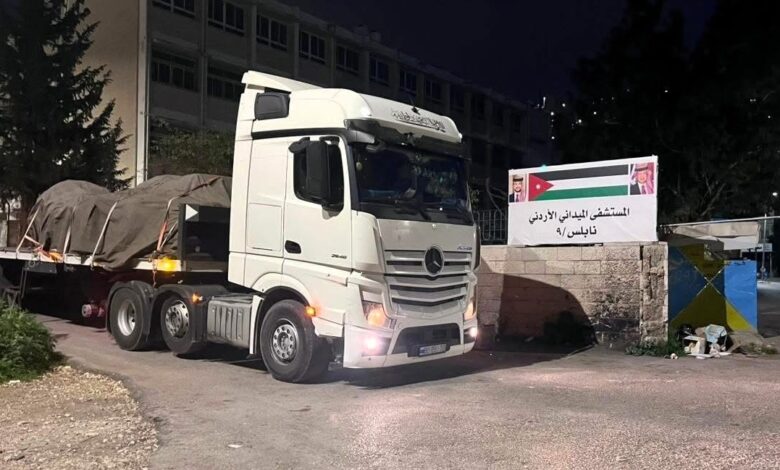 القوات المسلحة تسير قافلة مساعدات تضم 6 شاحنات إلى المستشفى الميداني الأردني في نابلس