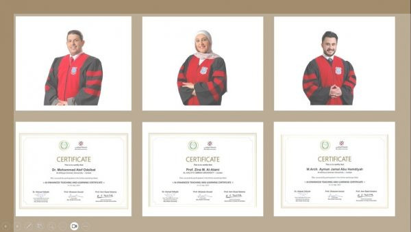 وقد حضر الورشة التدريبية كلًا من: الأستاذ الدكتورة زينة العلمي نائب عميد كلية العلوم الطبية المساندة، والدكتور محمد عضيبات من كلية الحقوق، والمحاضر المهندس أيمن أبو حمدية من كلية العمارة والتصميم، حيث خاضوا تجربة تعليمية متميزة تهدف إلى تطوير قدراتهم في دمج تقنيات الذكاء الاصطناعي ضمن أساليب التدريس والتعلم.