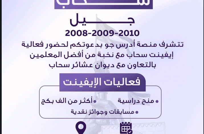 إيماناً بمسؤوليتها تجاه جيل المستقبل، وتعزيزاً لسبل التواصل المباشر مع الطلبة، أعلنت منصة “أدرس جو” التعليمية، بالتعاون مع ديوان عشائر سحاب، عن إقامة فعالية “إيفنت سحاب” الكبرى، والتي تأتي تزامناً مع احتفالات المملكة بـ “يوم العلم” والأعياد الوطنية المجيدة.