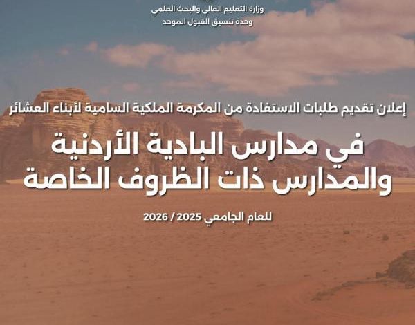 أعلنت اللجنة العليا للمكرمة الملكية السـامية لأبناء العشائر في مـدارس البـادية الأردنية والمدارس ذات الظـروف الخاصة في وزارة التعليم العالي والبحث العلمي، عن بدء تقديم طلبات الاستفادة من المكرمة الملكية السامية للعام الجامعي 2025-2026، وذلك اعتباراً من صباح اليوم الأحد وحتى الساعة الثانيـة عشرة ليلاً من يوم الأحد الموافق 24-8-2025.