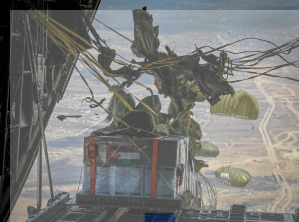 نفذت القوات المسلحة الأردنية، اليوم الاحد، عملية إنزال جوي إلى قطاع غزة، شاركت في العملية بالإضافة إلى طائرات سلاح الجو الملكي الأردني، طائرات من كل من جمهورية ألمانيا و دولة الإمارات العربية المتحدة و مملكة بلجيكا و جمهورية فرنسا وجمهورية إيطاليا و مملكة هولندا ومملكة الدنمارك وجمهورية اندونسيا، حيث تم إسقاط نحو (106) طناً من المواد الغذائية والإغاثية داخل القطاع.